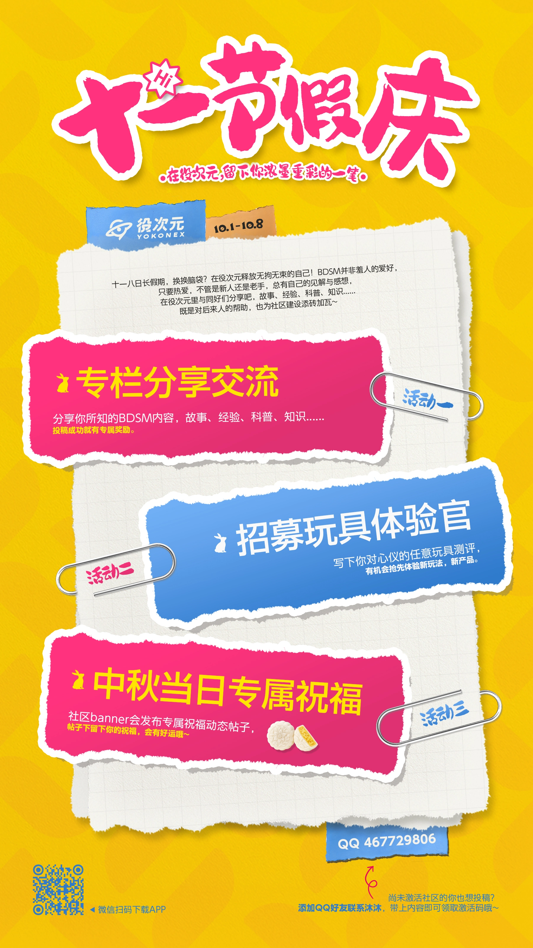 宝子们,佳节将至,役次元祝大家—— 国庆中秋,长假快乐~🥰 八天长假怎么过? 继续禁欲?还是疯狂放纵? 役次元社区节庆活动10.1同步开启 第二届社区专栏节,投稿分享BDSM相关内容,会有好礼相送 玩具测评,分享喜欢的小玩具,有机会抢先体验役次元最新产品 中秋送祝福,社区动态留言会有好事发生哦~😘 更多内容可看图片或进入社区了解 转发+关注,10.6,抽取役次自选玩具一个! 再祝宝子们长假开心,平安玩乐~🥰🥰