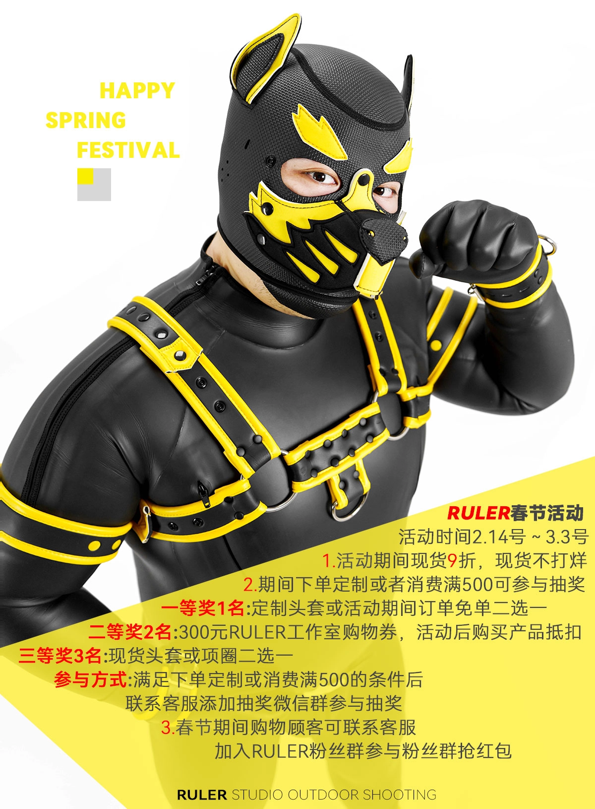 RULER春节活动来啦🎊 活动时间2.14号~3.3号 1.期间现货9折,春节现货不打烊 2.活动期间下单定制头套或者消费满500,可参与抽奖(详细奖品和参与方式请看图😘) 3.期间购物顾客可联系客服加入RULER粉丝群,春节参与粉丝群抢红包 4. 评论点赞转发此条消息 抽一位获得定制狗狗头套😍 抽两位获得双层头套😍