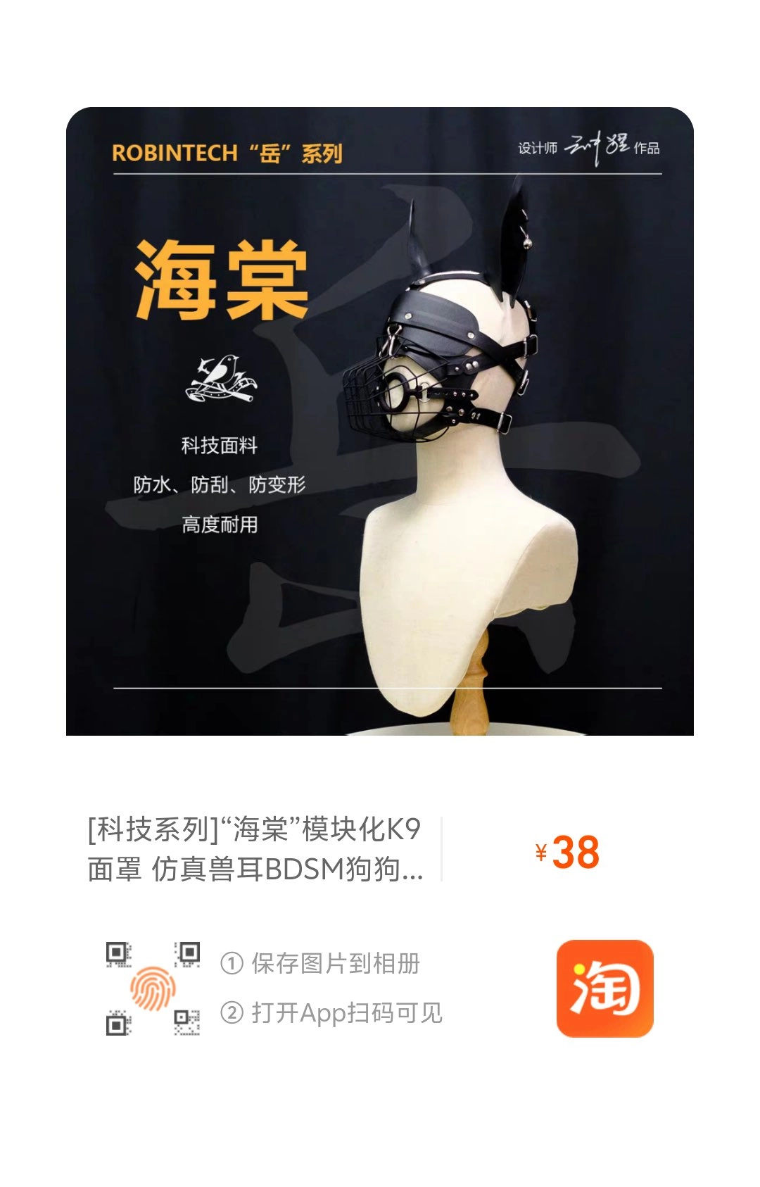 颠覆科技系列首款产品——“海棠”k9面罩上架! 业内首创的“ROBINTECH”科技面料,高度耐磨抗刮,防水抗汗,不易变形。 配有真皮高仿真兽耳、可拆卸眼罩、快拆鼻钩、快拆嘴笼、快拆口塞。 纯手工量身定制,极度耐用且兼顾经济性,是专业玩家的首选。 即日起前5名购买有30元优惠卷~全套到手仅3xx,预购从速哦