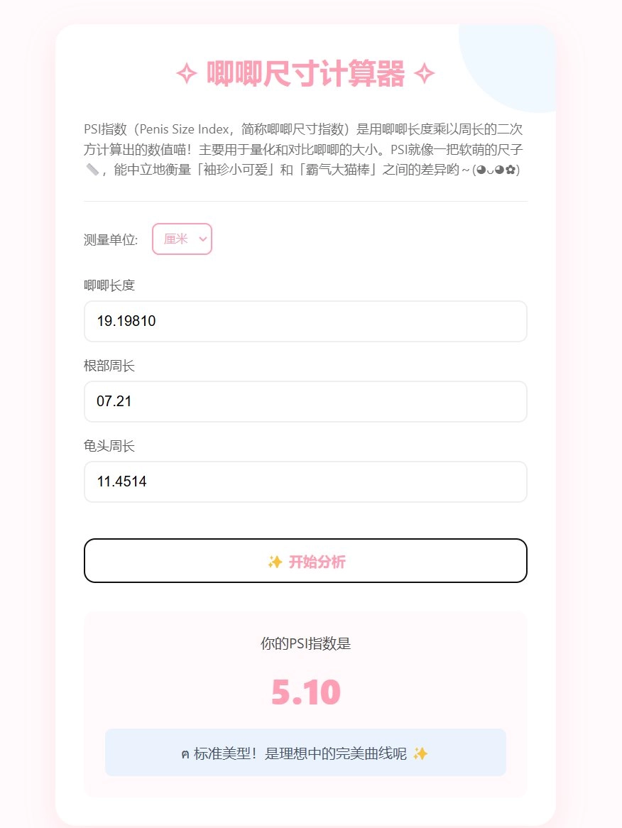 熬夜摸的唧唧大小计算器( 仿了BMI定了一个PSI标准,可以量化唧唧的尺寸。 3-7是正常尺寸,1-2算小,7-8算大 其他就是超级迷你或者超级大了( 地址:file.mtxtf.com/PSI.html