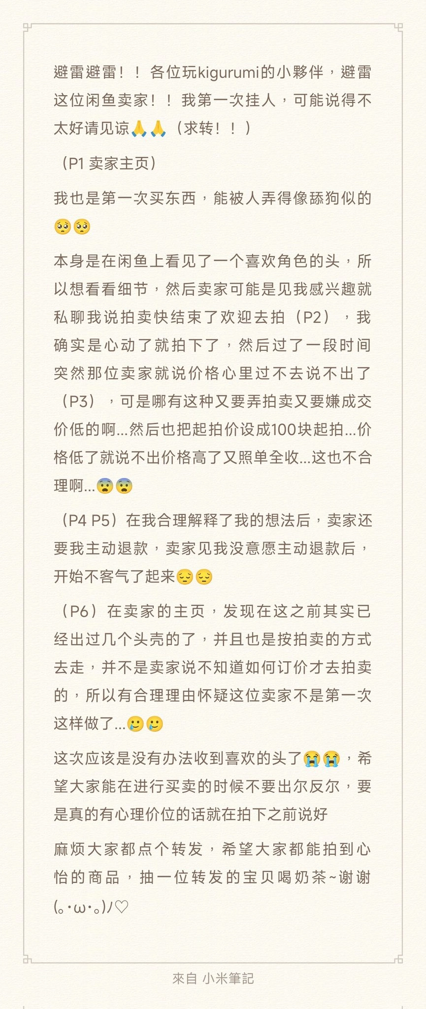避雷避雷!!各位玩kigurumi的小夥伴,避雷这位闲鱼卖家!我第一次挂人,可能说得不太好请见谅🙏🙏(求转!) 这次应该是没有办法收到喜欢的头了😭😭,希望大家能在买卖时候不要出尔反尔 麻烦大家都点个转发,希望大家都能拍到心怡的商品,抽一位转发的宝贝喝奶茶~谢谢(。・ω・。)ノ♡