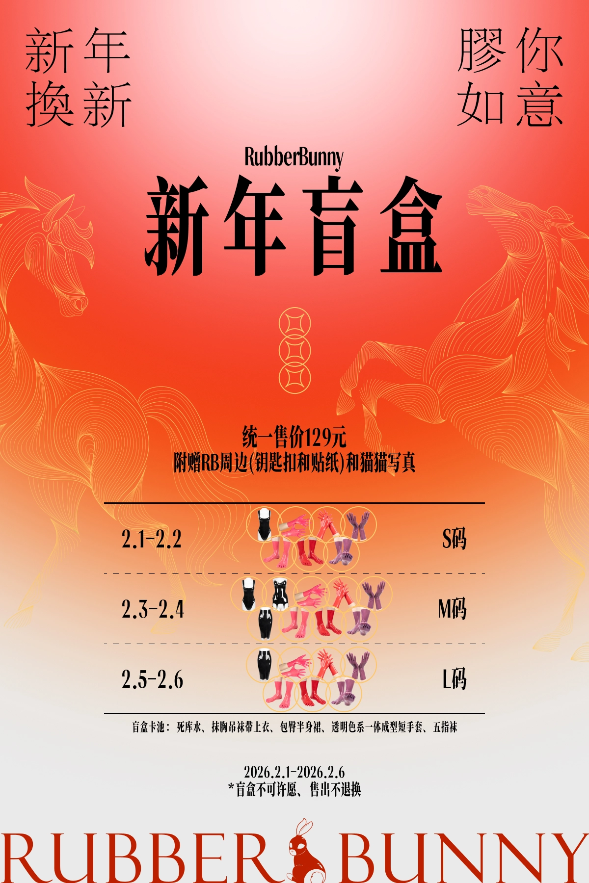 【免费送】+【黄金周】最后7️⃣天透底福利: ⭐1.25~31维持旧定价+叠加新春折扣+每天前五名赠礼+超值盲盒 (折扣详情看海报) ⭐免费送: 一键三连本帖子,评论区抽:黑色定码基础款3️⃣件 (以上2月1日开奖后秒发货) 02.01~02.28全店折扣不变,部分产品调整价格 🍑淘宝:rubberbunny