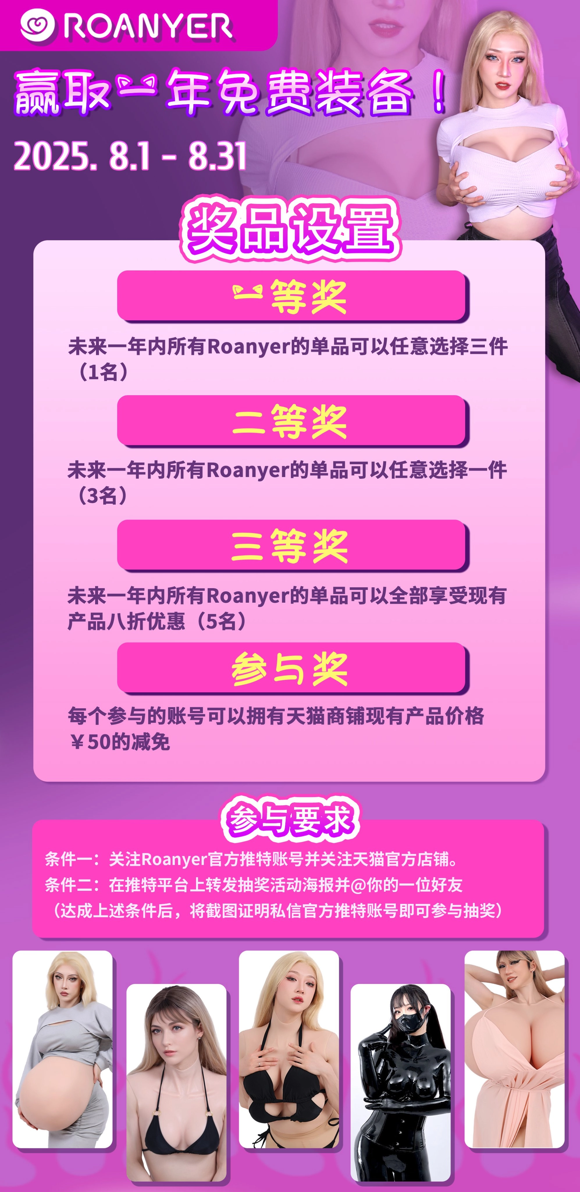 媛野年中大抽奖来了!! 宝子们速速集合!即可赢得免费装备 豪华抽奖池重磅升级: 1.免费装备任你选; 2.天猫折上折活动; 双重福利参与就有: ①参与活动 必得媛野店铺人民币50减免券,对任意在售商品都有效! ② 转发就可以获得抽奖资格,海量豪礼等你抱走! 活动时间:8月1日-8月30日