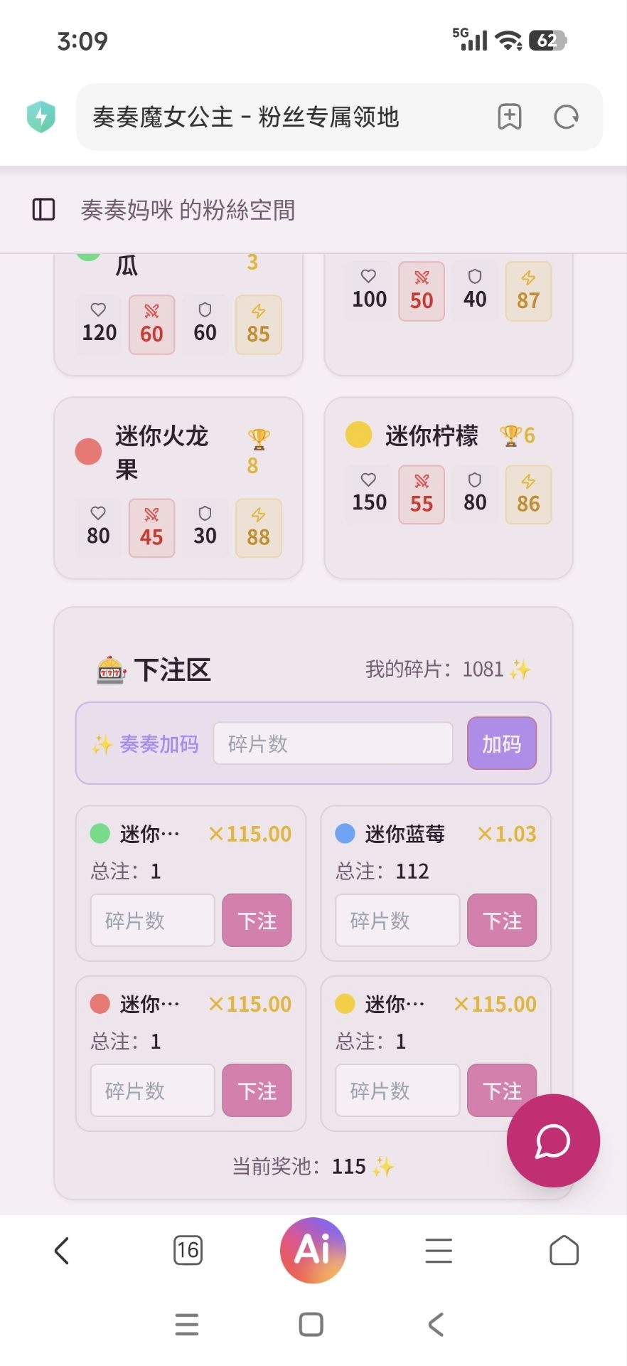 奏奏公主在做什么? 答案:用爱发电,和程序员宝宝,美术策划一起给喜欢我的粉丝们献上一份究极的大礼 这个项目是网游,用时一个多月,已经增加了很多的玩法内容和剧情,以及原创的怪物素材,奏奏表情包,立绘。 今天上线了赛博斗蛐蛐(史莱姆赛马)世界频道很热闹,想见证这款游戏的成长,就加简介qq吧~