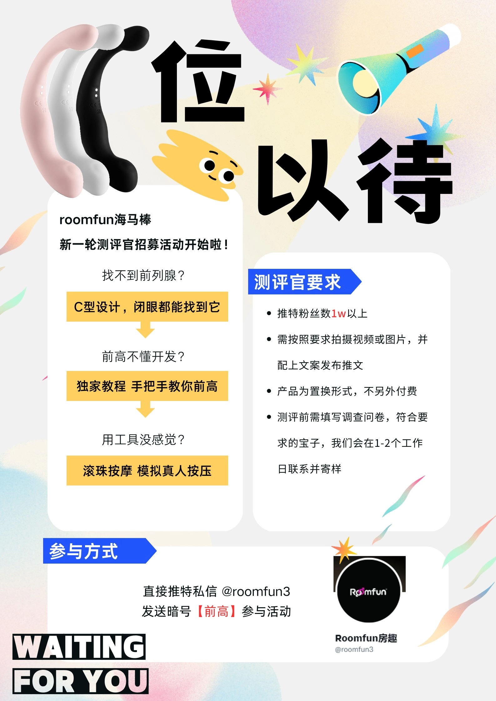 海马前列腺按摩棒新一轮测评活动来咯! 前高开发就选 #roomfun海马棒 这次测评活动给了20个名额,照样是先到先得,给完为止。 另外,转这条推+关注我,揪个宝子当锦鲤,店里¥500以下的产品随便挑(限1个)!4月17日15:00开奖 #前高 #前列腺高潮