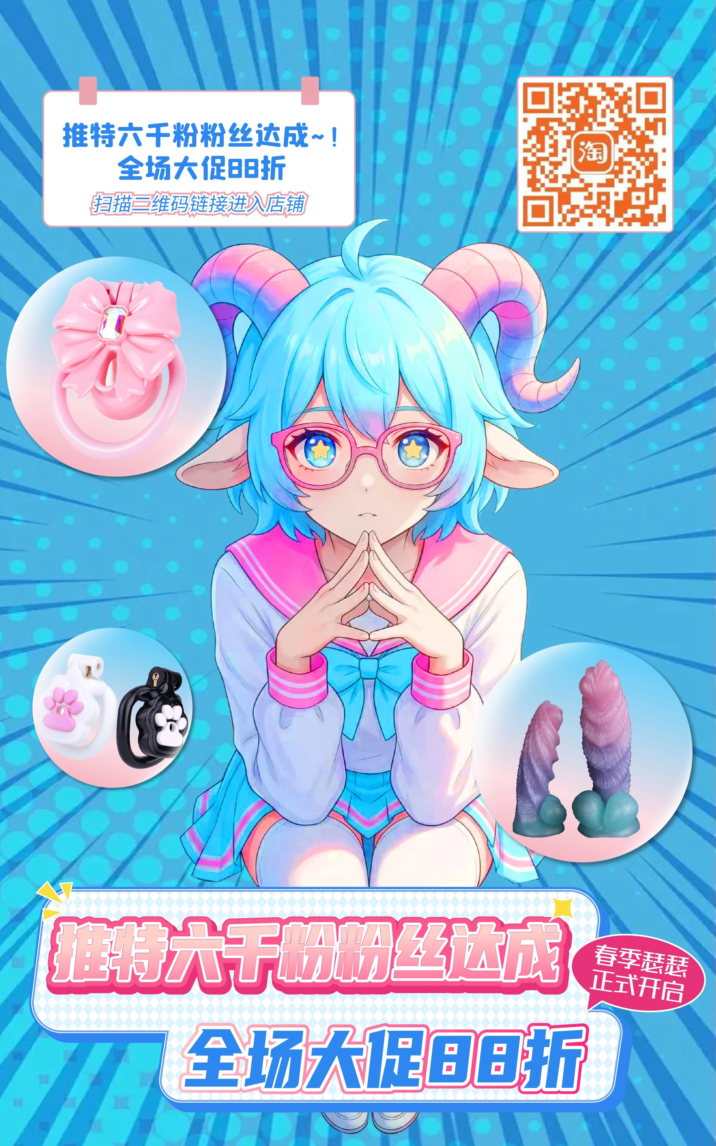 😍汐潮家终于六千粉丝啦~ 👅香软店铺开启全场88折大促活动~ 😀现在~马上~立刻开始! 🤩关注转发这条推特~~赠送猫爪平板锁、夜光铂金jj、男娘飞机杯各一个。(名额只有两人~!) 店铺地址:shop316137350.taobao.com/?sp… 欢迎大家在大促期间进店消费和调戏小男娘客服哦~