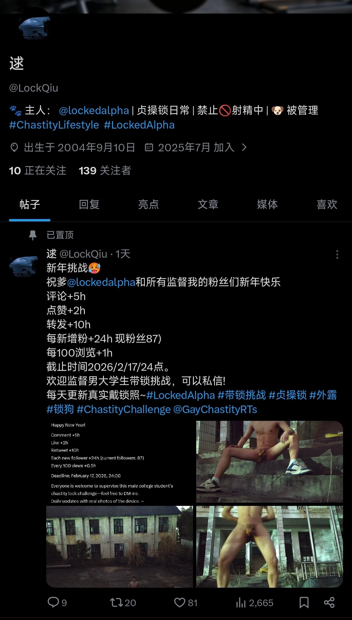 在爹@lockedalpha和粉丝的监督下,🐶佩戴时间更新了!最新时间统计: 点赞 :81 × 2h = 162h 评论 :9 × 5h = 45h 转发 :20 × 10h = 200h 新增粉丝 :52 × 24h = 1248h 浏览量加时 +26h 总加时:1655h + 26h = 1681小时 ≈ 70天 #带锁挑战 #贞操锁 #cb锁 #精液管理 #ChastityChallenge #LockedAlpha